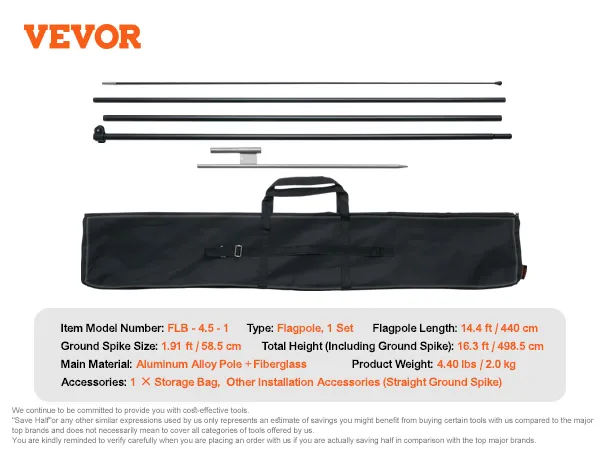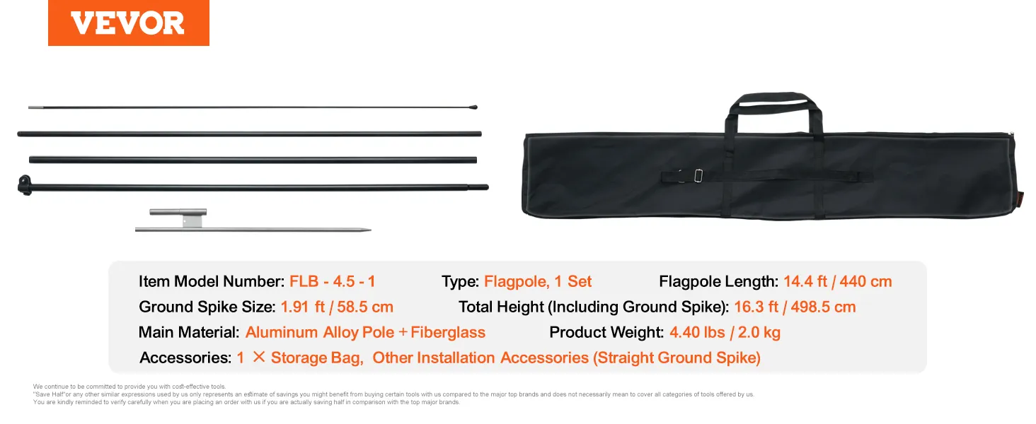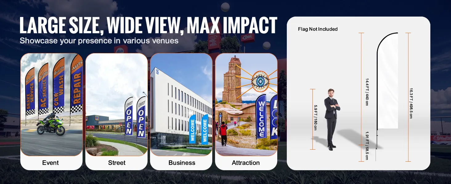 Large Size, High Visual Impact: The total height: 16.3 ft (including ground stake), the flagpole height: 14.4 ft. Its large size enhances the flag's visibility and draws attention from a distance, ideal for outdoor advertising and events. (Flag not included)