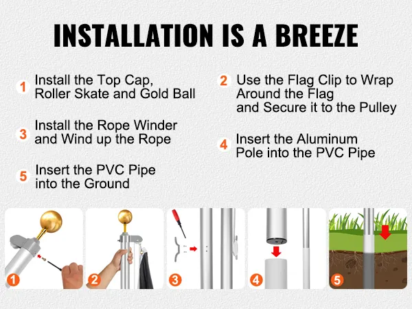 Our detachable flagpole kit includes detailed installation instructions. From installing the gold ball and pulley on the main pole to securing the flag with aluminum clips, installing the rope winder and fitting the detachable aluminum tube, and finally inserting the PVC pipe underground.