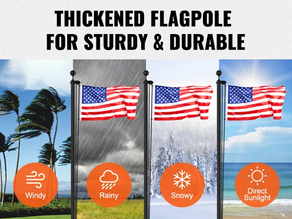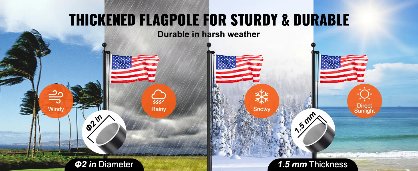 φ2in Thickened Flagpole:Made from heavy-duty aluminum for long-lasting durability.In the event of severe weather such as heavy rain, it is recommended that the flagpole be lowered