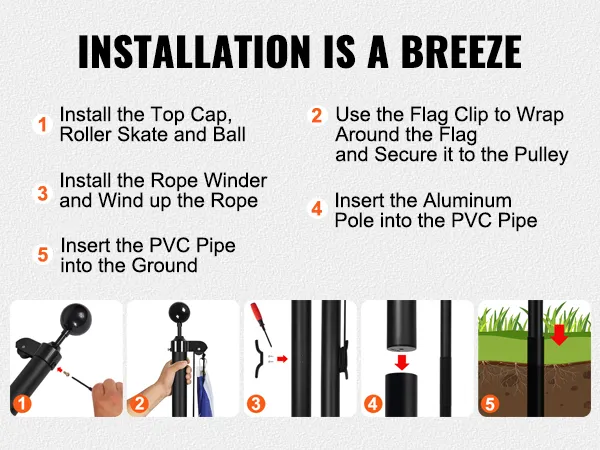Our detachable flagpole kit includes detailed installation instructions. From installing the gold ball and pulley on the main pole to securing the flag with aluminum clips, installing the rope winder and fitting the detachable aluminum tube, and finally inserting the PVC pipe underground.