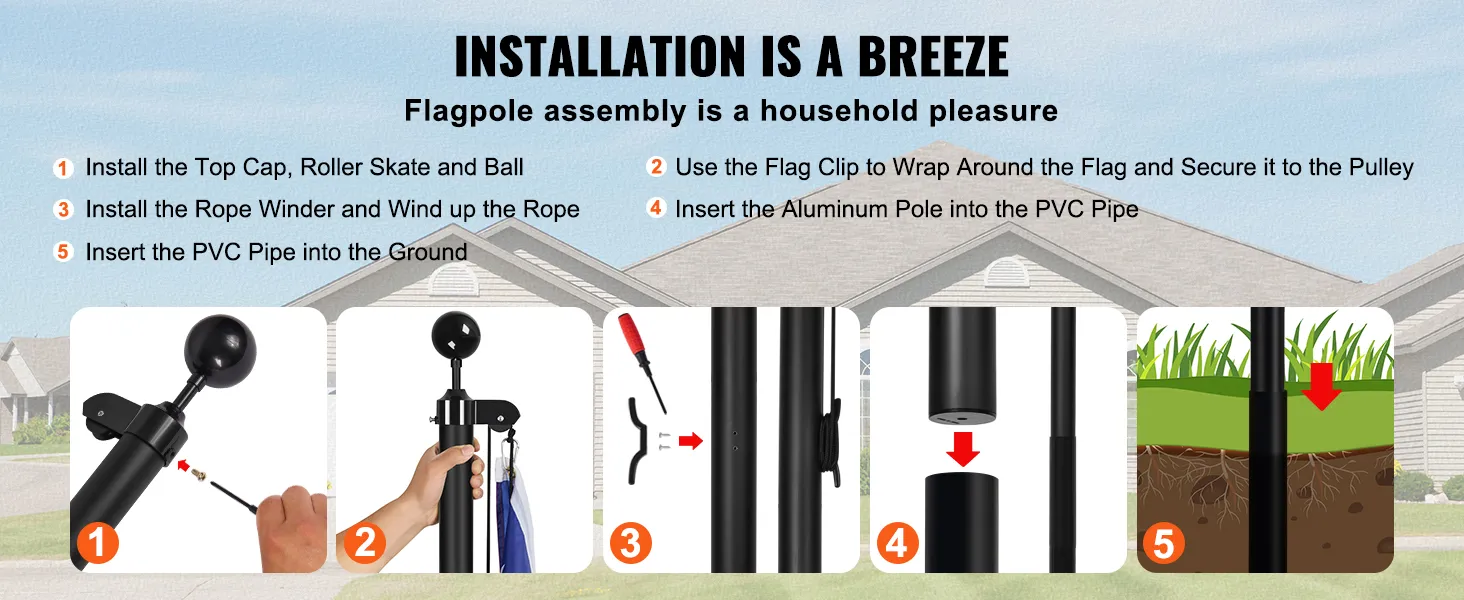 Easy Installation: We offer comprehensive installation instructions and various accessories such as PVC pipes, balls, and aluminum clips, making it easy for you to assemble the flagpole. Ideal for users who prefer to independently complete assembly tasks, such as homeowners or veterans, making installation straightforward and manageable.