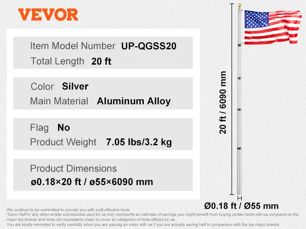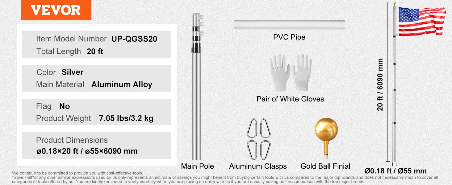 Eenvoudige installatie: wij bieden gedetailleerde instructies en verschillende installatieaccessoires zoals PVC-buizen, ballen en aluminium beugels om een eenvoudige montage van de vlaggenmast te garanderen. Ideaal voor gebruikers die de voorkeur geven aan onafhankelijke montagetaken, zoals huiseigenaren of veteranen, waardoor de installatie eenvoudig en beheersbaar wordt.