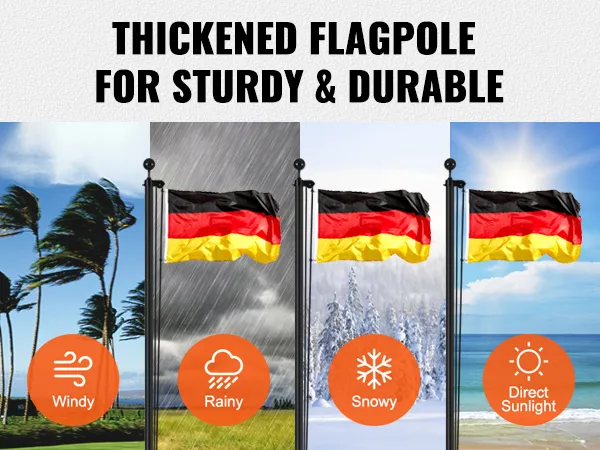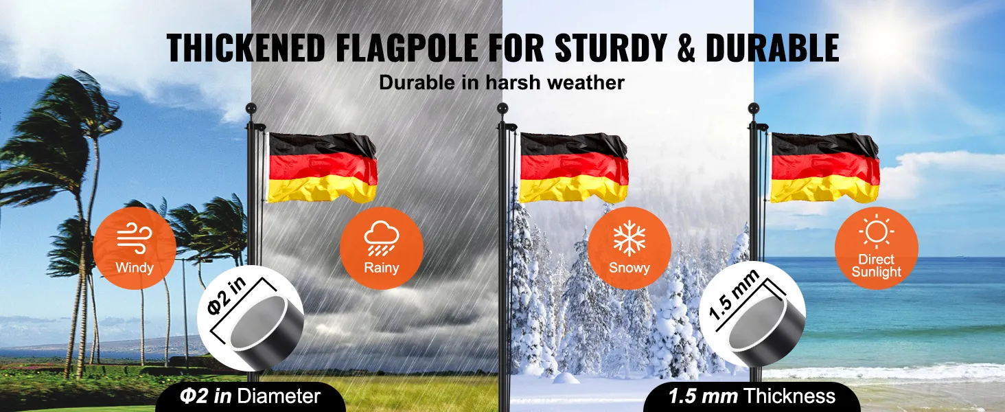 φ2in Thickened Flagpole:Made from heavy-duty aluminum for long-lasting durability.In the event of severe weather such as heavy rain, it is recommended that the flagpole be lowered