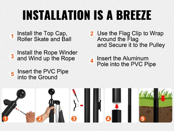 Our detachable flagpole kit includes detailed installation instructions. From installing the gold ball and pulley on the main pole to securing the flag with aluminum clips, installing the rope winder and fitting the detachable aluminum tube, and finally inserting the PVC pipe underground.
