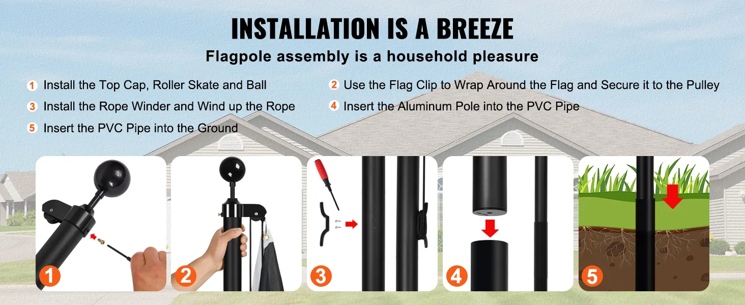 Easy Installation: We offer comprehensive installation instructions and various accessories such as PVC pipes, balls, and aluminum clips, making it easy for you to assemble the flagpole. Ideal for users who prefer to independently complete assembly tasks, such as homeowners or veterans, making installation straightforward and manageable.