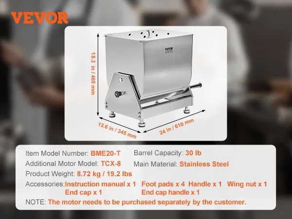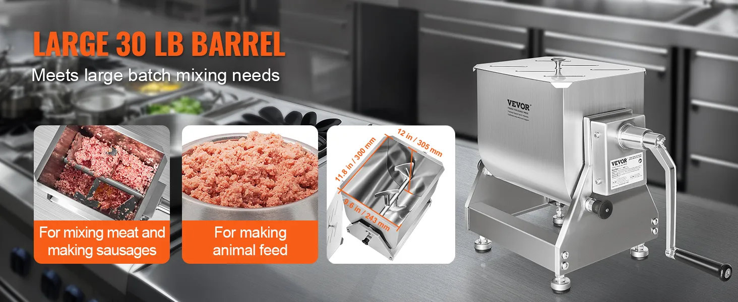 De VEVOR 30-pond kantelbare handmatige vleesmixer is perfect voor het mengen van grote hoeveelheden vlees. Het heeft een capaciteit van 30 pond, dus het is ideaal voor het maken van worst, mengsels en andere delicatessen. De roestvrijstalen constructie zorgt voor duurzaamheid en levensduur. Het gekantelde ontwerp zorgt voor eenvoudig uitladen. Dit maakt het handig voor elke keuken of commerciële setting.