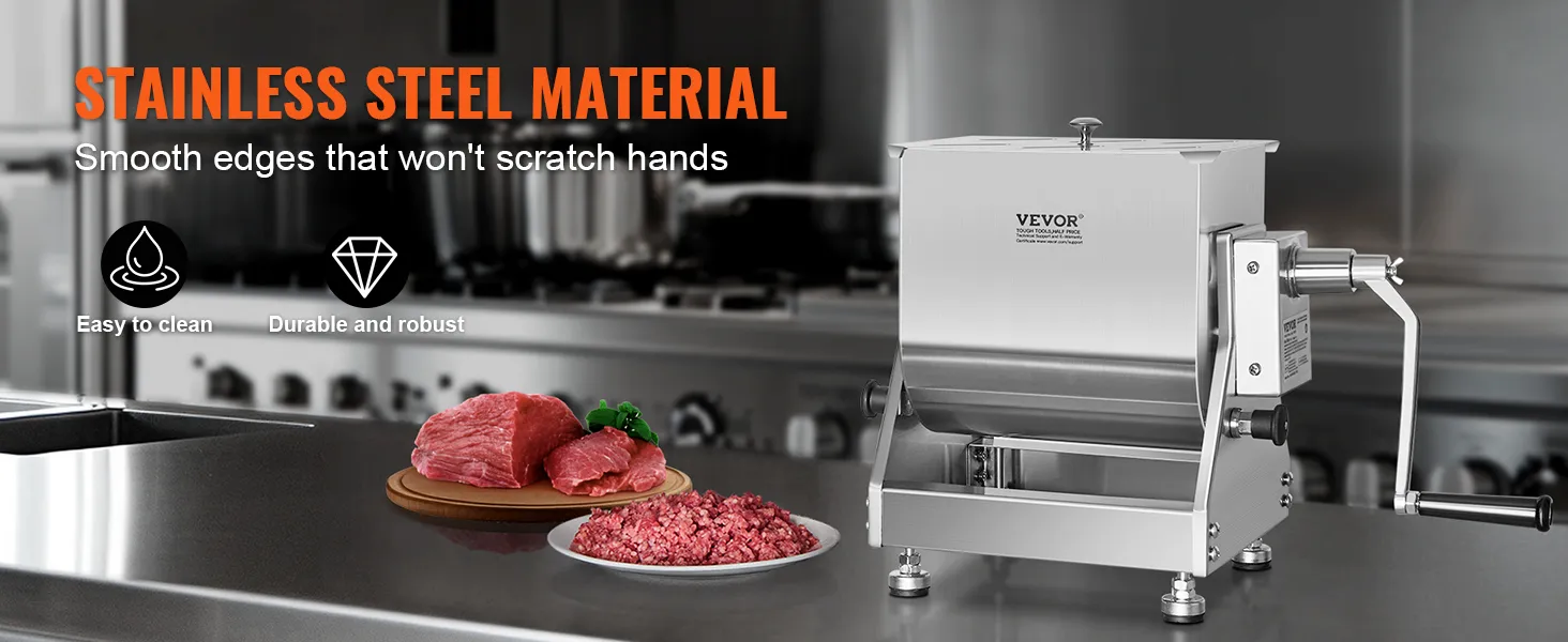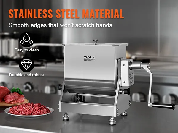 De VEVOR roestvrijstalen vleesmenger heeft een glad, gemakkelijk schoon te maken oppervlak. De verwijderbare mengpeddels vereenvoudigen grondige reiniging zonder geuren. Het roest- en corrosiebestendige roestvrij staal zorgt ervoor dat uw investering langer meegaat. Dit maakt het ideaal voor zowel thuisgebruik als commerciële keukens waar hygiëne essentieel is.