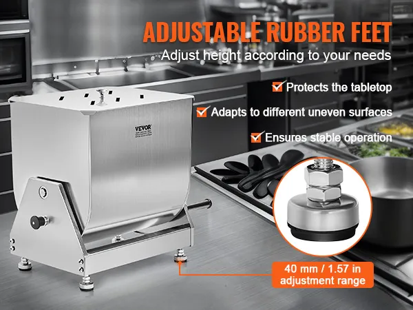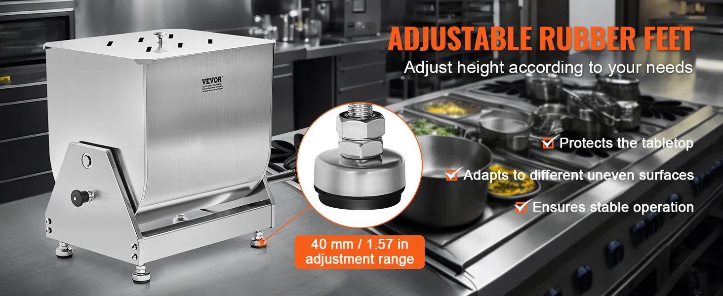 Deze handmatige vleesmenger biedt flexibiliteit. Hij kan worden omgebouwd tot een elektrische mixer met de VEVOR aandrijfmotor TCX-8. Dit maakt het een veelzijdig hulpmiddel voor verschillende vleesmengbehoeften. De verstelbare voeten zorgen voor stabiliteit op elk oppervlak, wat een veilige en stabiele werking garandeert.