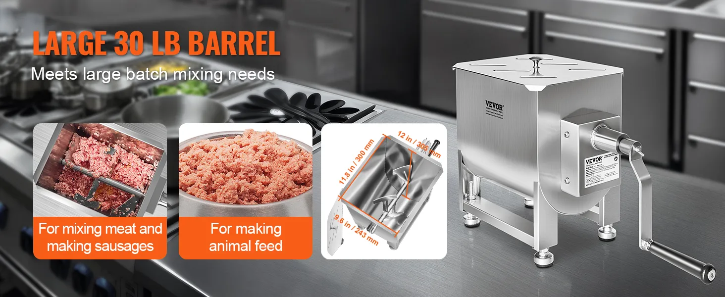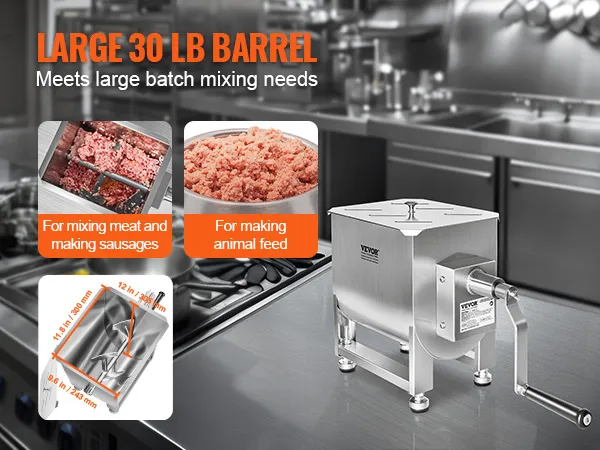 Large Capacity Barrel: The mixing barrel measures 300 x 243 x 305 mm / 11.8 x 9.6 x 12 in and can mix approximately 30 pounds of meat ingredients at a time. It is ideal for making large batches of sausages and other delicacies or blending feed for animal food.