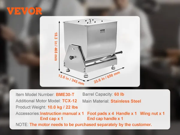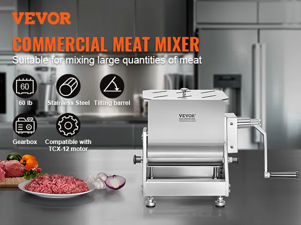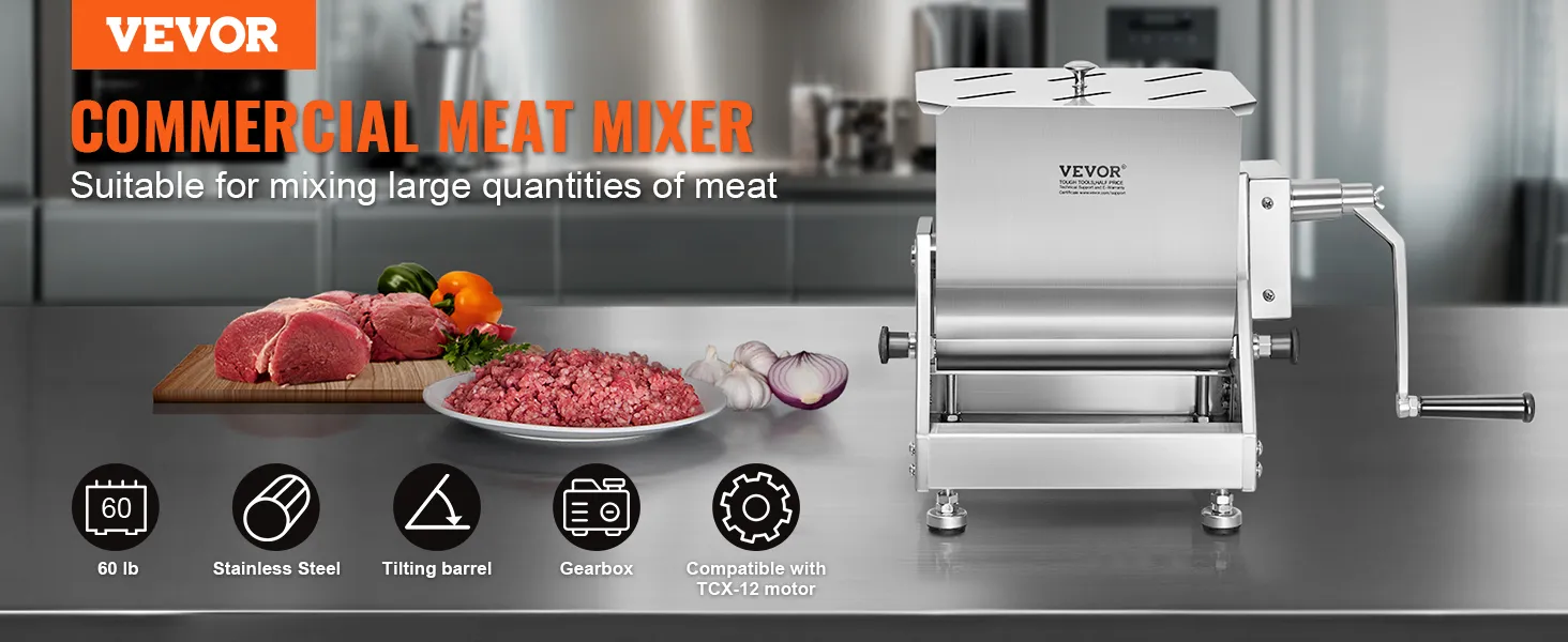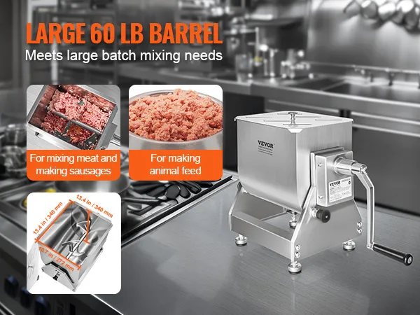 Large Capacity Barrel: The mixing barrel measures 340 x 272 x 340 mm / 13.4 x 10.7 x 13.4 in and can mix approximately 60 pounds of meat ingredients at a time. It is ideal for making large batches of sausages and other delicacies or blending feed for animal food. The tilting design facilitates easy unloading of meat.