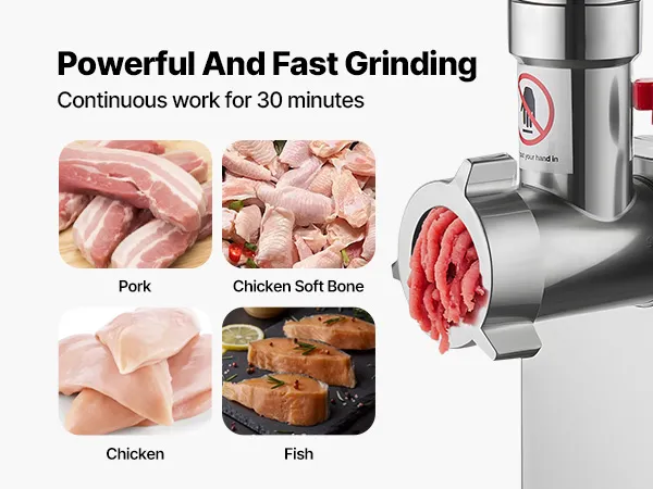 De 600W pure koperen motor maalt 2,04 kg vlees per minuut. De elektrische vleesmolen kan continu en zonder onderbreking werken, waardoor hij ideaal is voor grootschalige commerciële vleesverwerking.