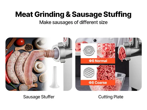 Veelzijdige accessoires: De machine wordt geleverd met twee scherpe vleesmolenmessen, twee snijplaten, een worstvuller en een vleesvermalser, zodat u verschillende soorten vlees kunt malen, zoals varkensvlees, rundvlees, wild, kip en vis, maar ook worsten en meer kunt maken.