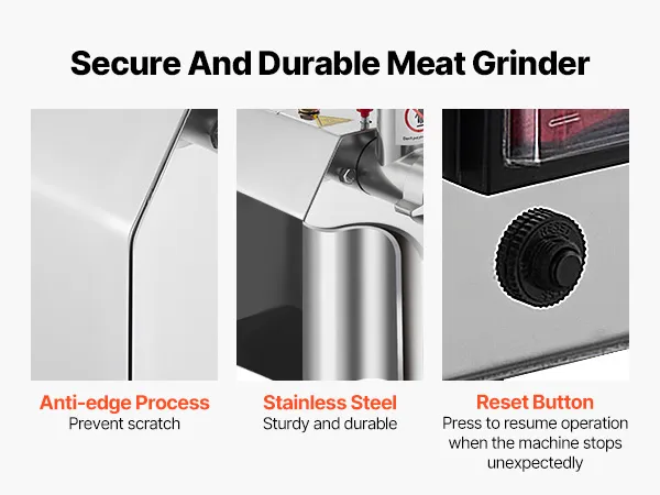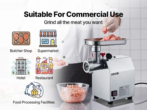 Snel malen: De commerciële vleesmolen met een vulopening van 8# is voorzien van een zeer efficiënte 600 watt motor van puur koper die 2,04 kg vlees per minuut maalt. Hij kan 30 minuten onafgebroken draaien, waardoor hij ideaal is voor het malen van vlees op grote schaal. Vermijd langdurig stilstaan, aangezien dit de motor kan beschadigen. Schakel de motor onmiddellijk uit wanneer deze niet in gebruik is.