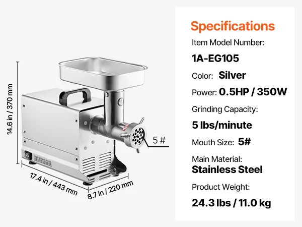 Fast Meat Grinding: The commercial countertop meat grinder, mouth size 5#, features a highly efficient 300W pure copper motor capable of grinding 5 lbs of meat per minute. It can operate continuously without interruption, making it ideal for large-scale commercial meat grinding needs. Avoid letting the grinder idle for too long as it may damage the motor. Remember to promptly turn off the power when not in use.