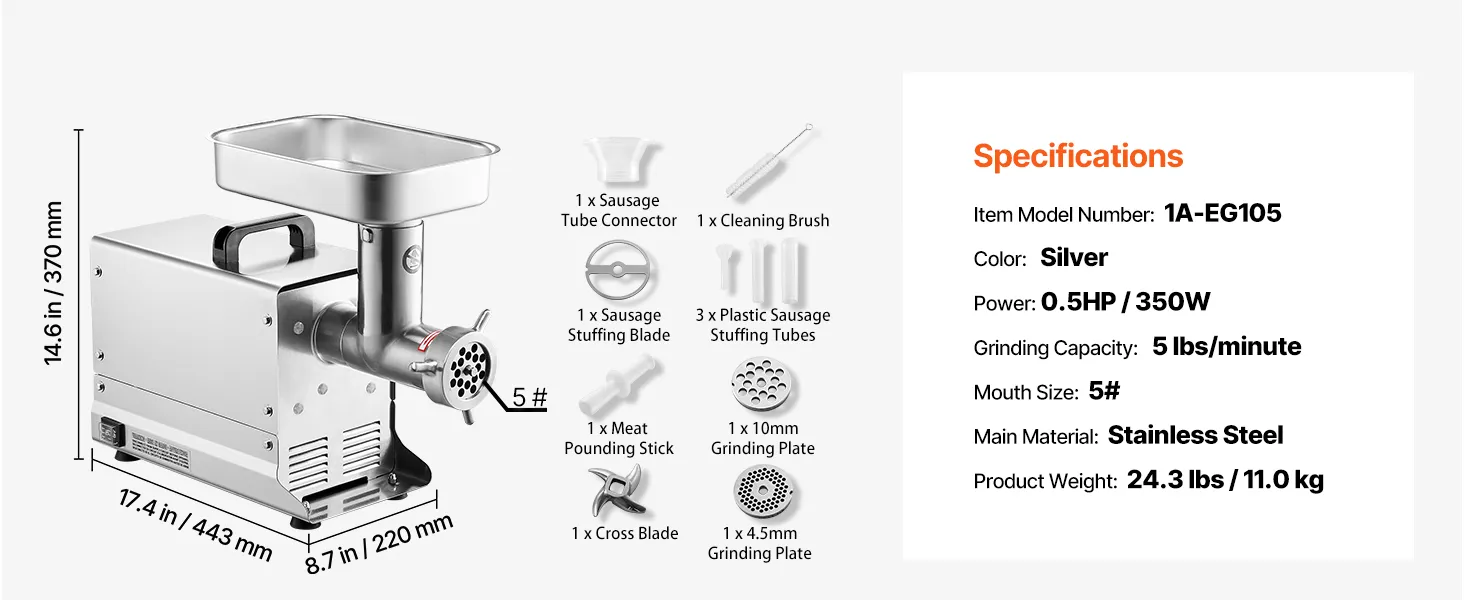 Versatile Accessories: Our commercial meat grinders come with 2*cross blades(one in grinder itself), 1*4.5mm meat grinder blade plate, 1*sausage stuffing plate, and 3*sausage stuffing tubes(0.47", 0.63",0.87" OD), 1*meat pounding stick, 1*cleanning brush, 1*machine head locking handle.