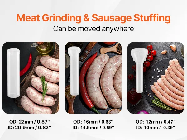 The commercial meat grinder includes three different diameters of sausage tubes, making it easy for you to make sausages of various sizes. Perfect for use in kitchens, bars, restaurants, and food processing facilities.