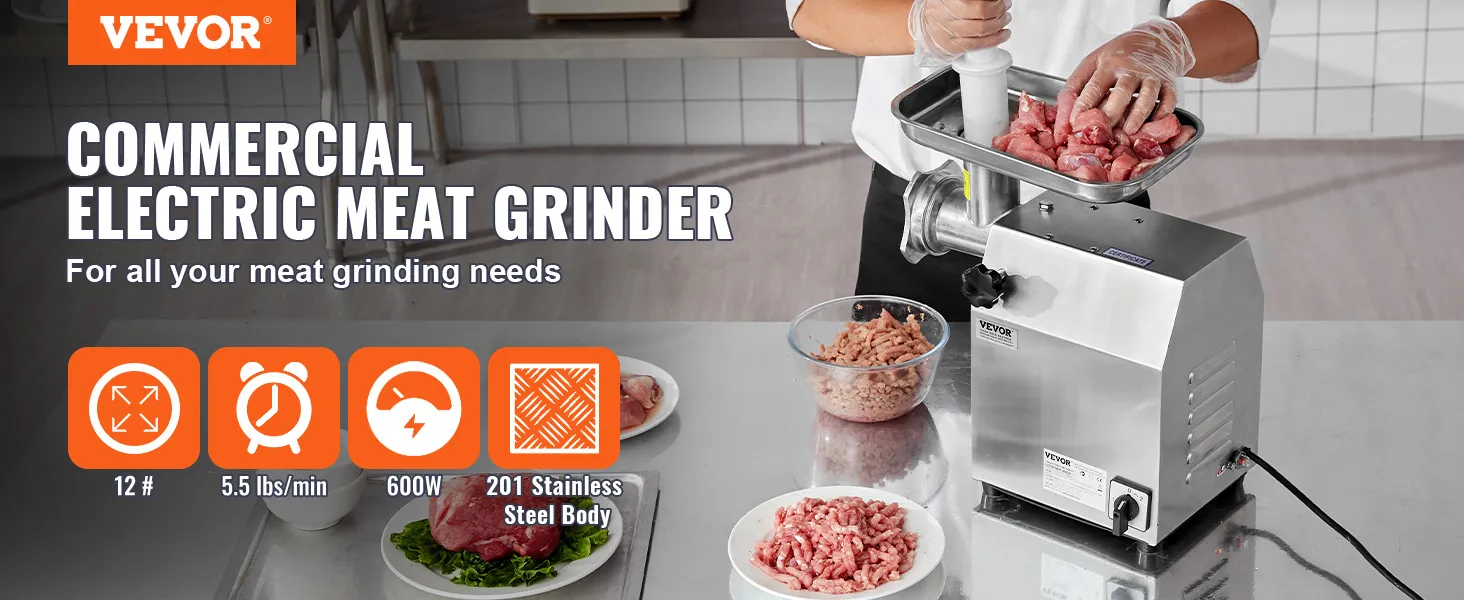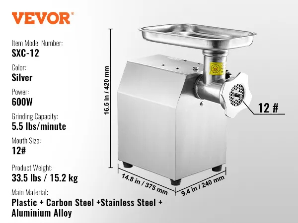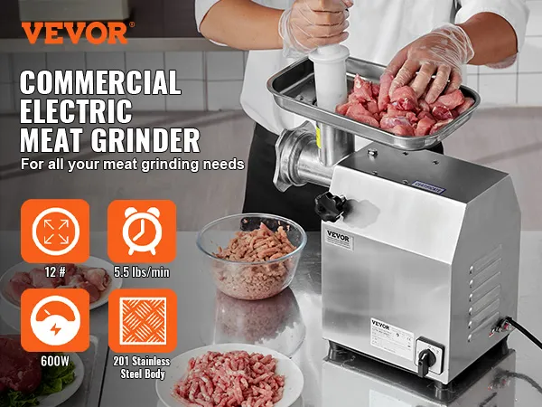 The commercial countertop meat grinder, mouth size 12#, features a highly efficient 600W pure copper motor capable of grinding 5.5 lbs of meat per minute. Made of stainless steel, it's sturdy and durable. The SUS420 blade that can grind various types of meat, making it ideal for commercial use.