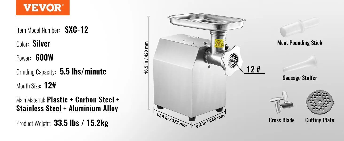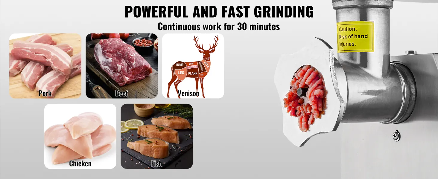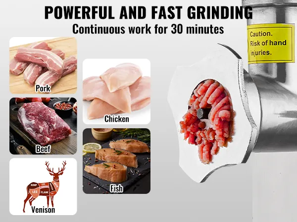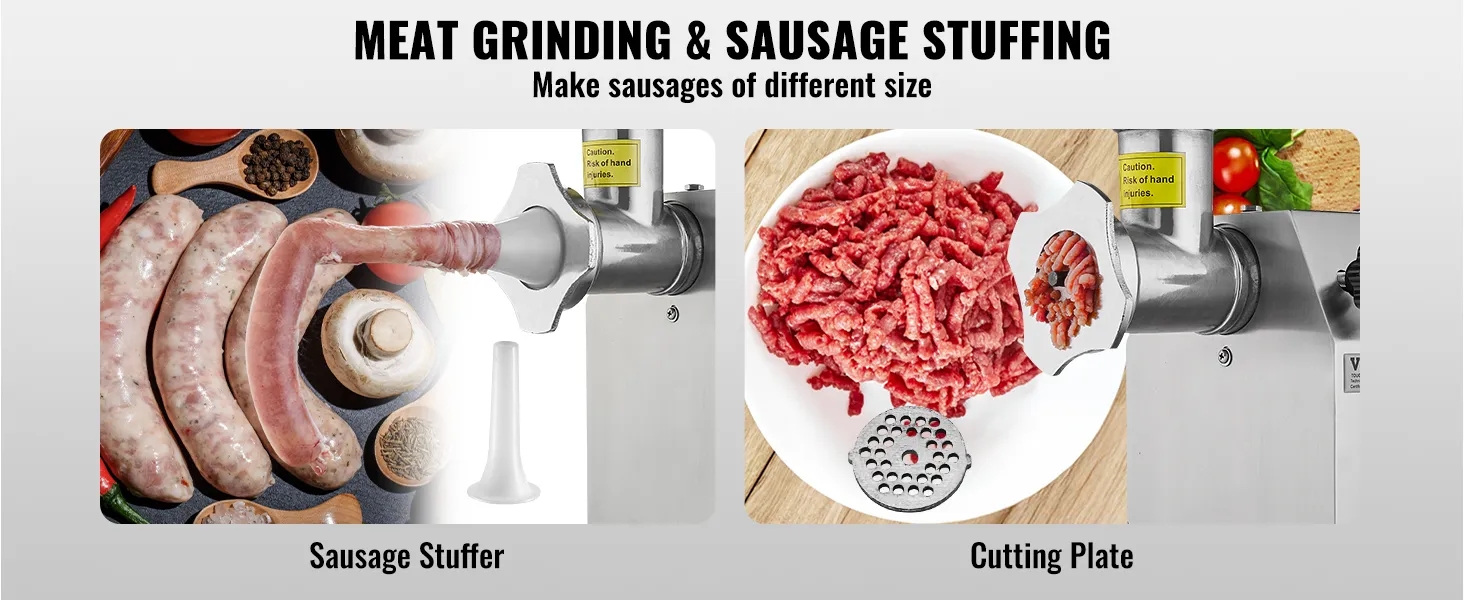 Versatile Accessories: The machine comes with a sharp meat grinder blade, cutting plate, and sausage stuffer, allowing you to grind various meats such as pork, beef, venison, chicken, and fish, as well as make sausages and more.