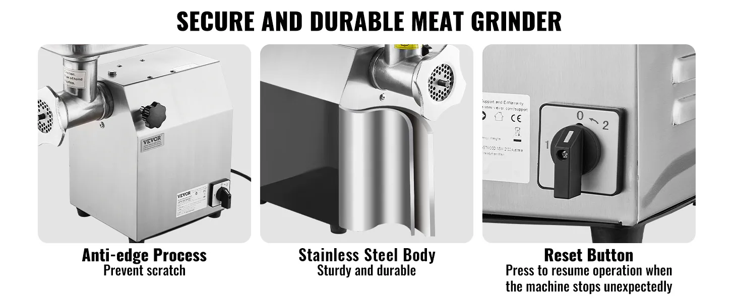 Our countertop meat grinder is mainly constructed from stainless steel, resistant to corrosion and wear. All parts in contact with food are made from food-grade materials, ensuring safety and durability.