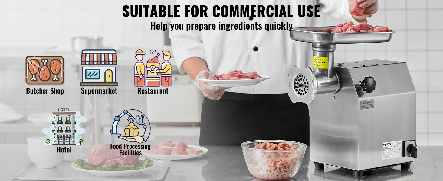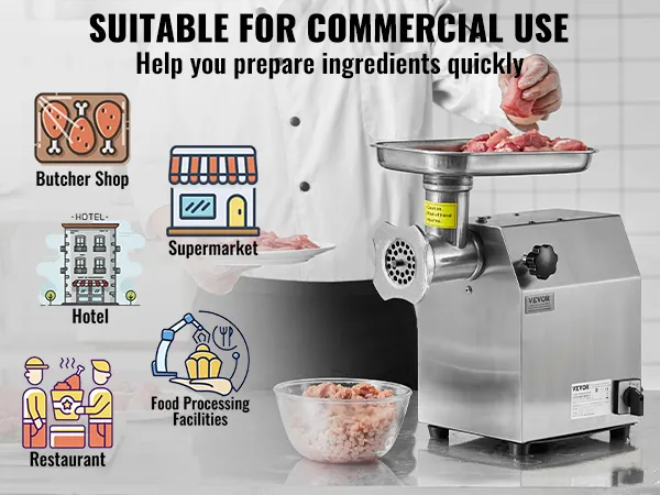 This meat grinder is suitable for grinding various types of meat, making it ideal for use in butcher shops, supermarkets, restaurants, hotels, and food processing facilities.