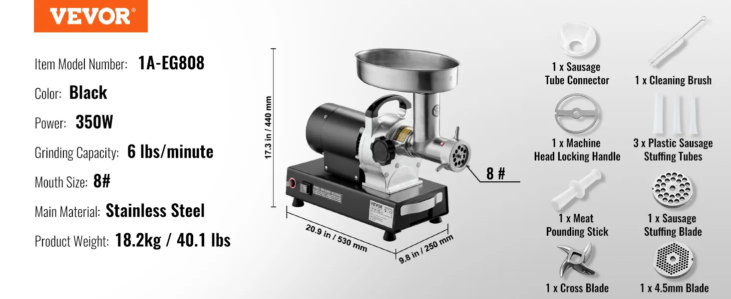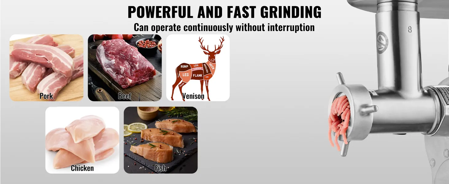 Versatile Accessories: Our commercial meat grinders come with 2*cross blades(one in grinder itself), 1*4.5mm meat grinder blade plate, 1*sausage stuffing plate, and 3*sausage stuffing tubes(0.47", 0.63",0.87" OD), 1*meat pounding stick, 1*cleanning brush, 1*machine head locking handle.