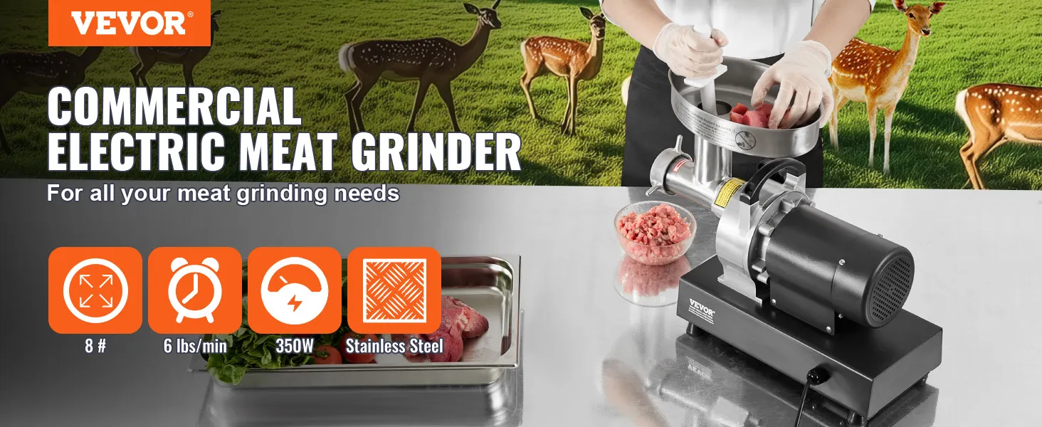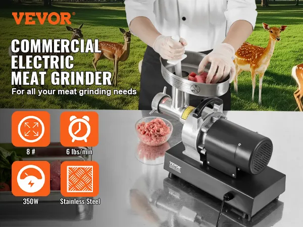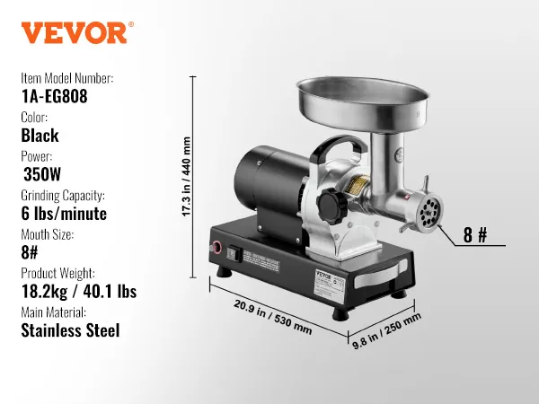 The commercial countertop meat grinder, mouth size 8#, features a highly efficient 350W pure copper motor capable of grinding 6 lbs of meat per minute. Made of stainless steel, it's sturdy and durable. The SUS420 blade that can grind various types of meat, making it ideal for commercial use.