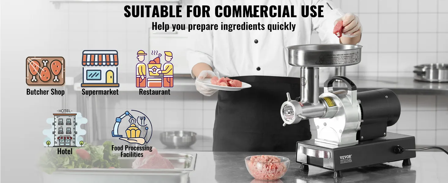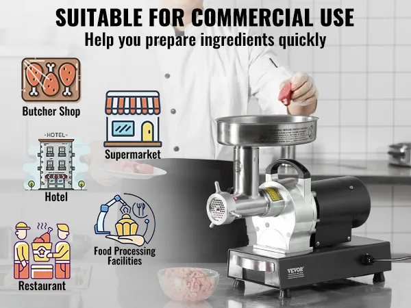 This meat grinder is suitable for grinding various types of meat, making it ideal for use in butcher shops, supermarkets, restaurants, hotels, and food processing facilities.