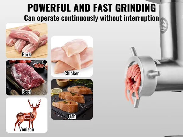 The 350W pure copper motor can grind 6 lbs of meat per minute. The electric meat grinder can operate continuously without interruption, making it ideal for large-scale commercial meat grinding needs.