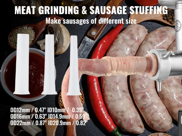 The commercial meat grinder includes three different diameters of sausage tubes, making it easy for you to make sausages of various sizes. Perfect for use in kitchens, bars, restaurants, and food processing facilities.