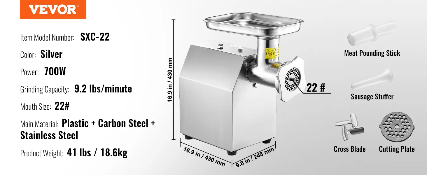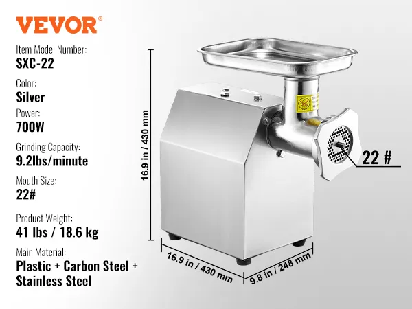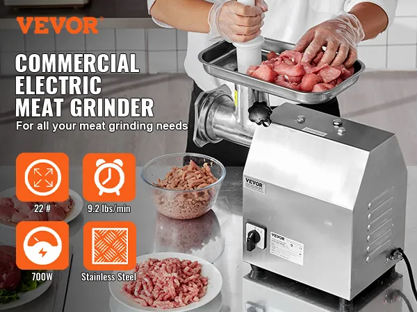The commercial countertop meat grinder, mouth size 22#, features a highly efficient 700W pure copper motor capable of grinding 9.2 lbs of meat per minute. Made of stainless steel, it's sturdy and durable. The SUS420 blade that can grind various types of meat, making it ideal for commercial use.