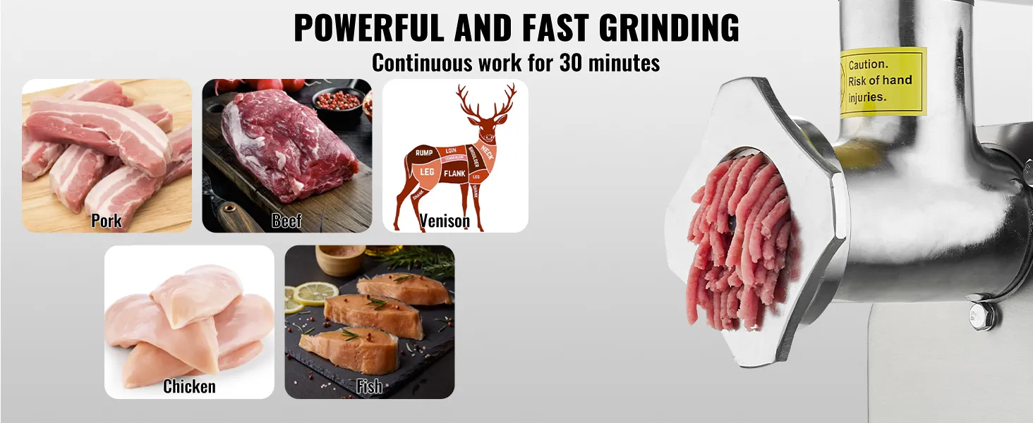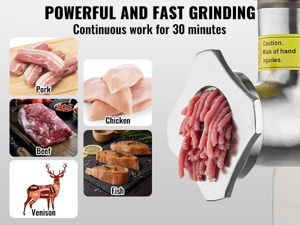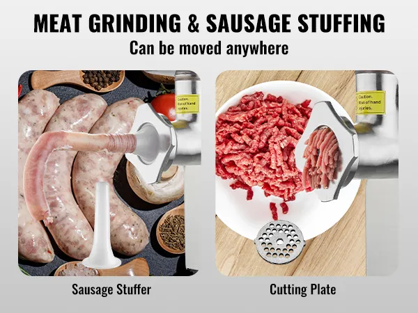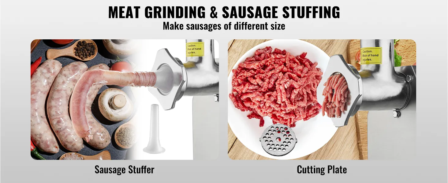 Versatile Accessories: The machine comes with a sharp meat grinder blade, cutting plate, and sausage stuffer, allowing you to grind various meats such as pork, beef, venison, chicken, and fish, as well as make sausages and more.
