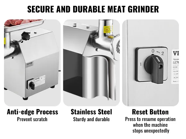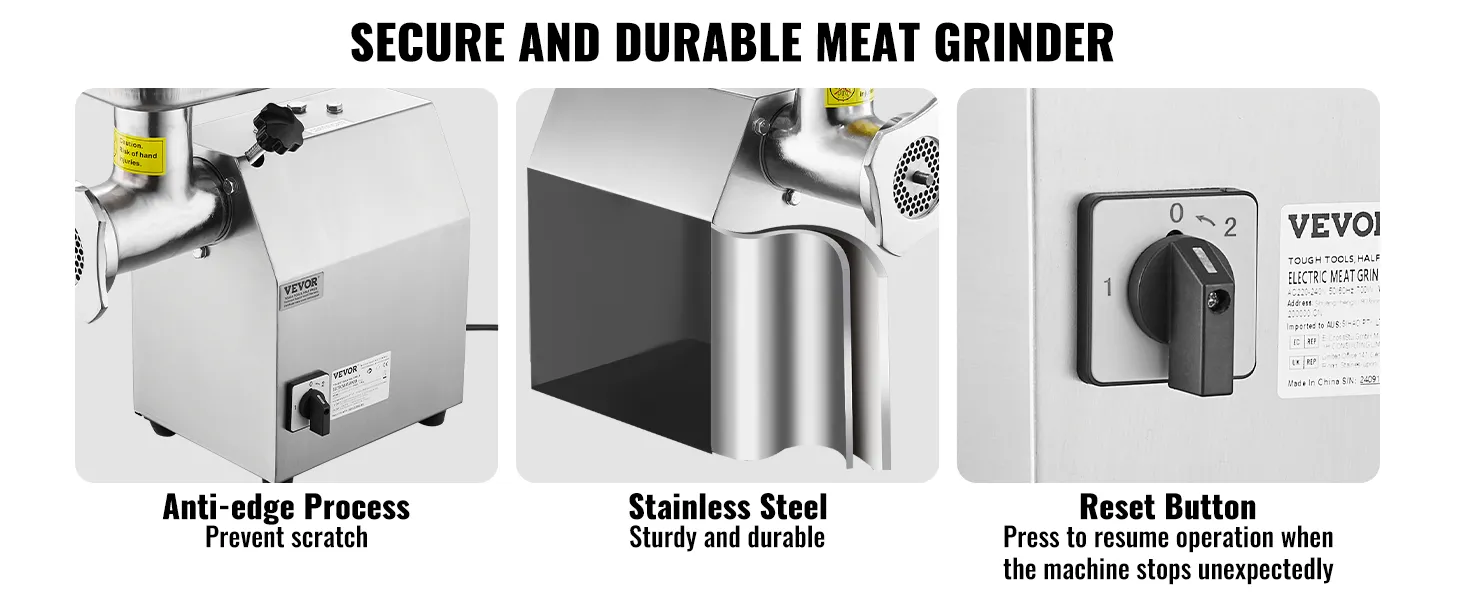 Our countertop meat grinder is mainly constructed from stainless steel, resistant to corrosion and wear. All parts in contact with food are made from food-grade materials, ensuring safety and durability.