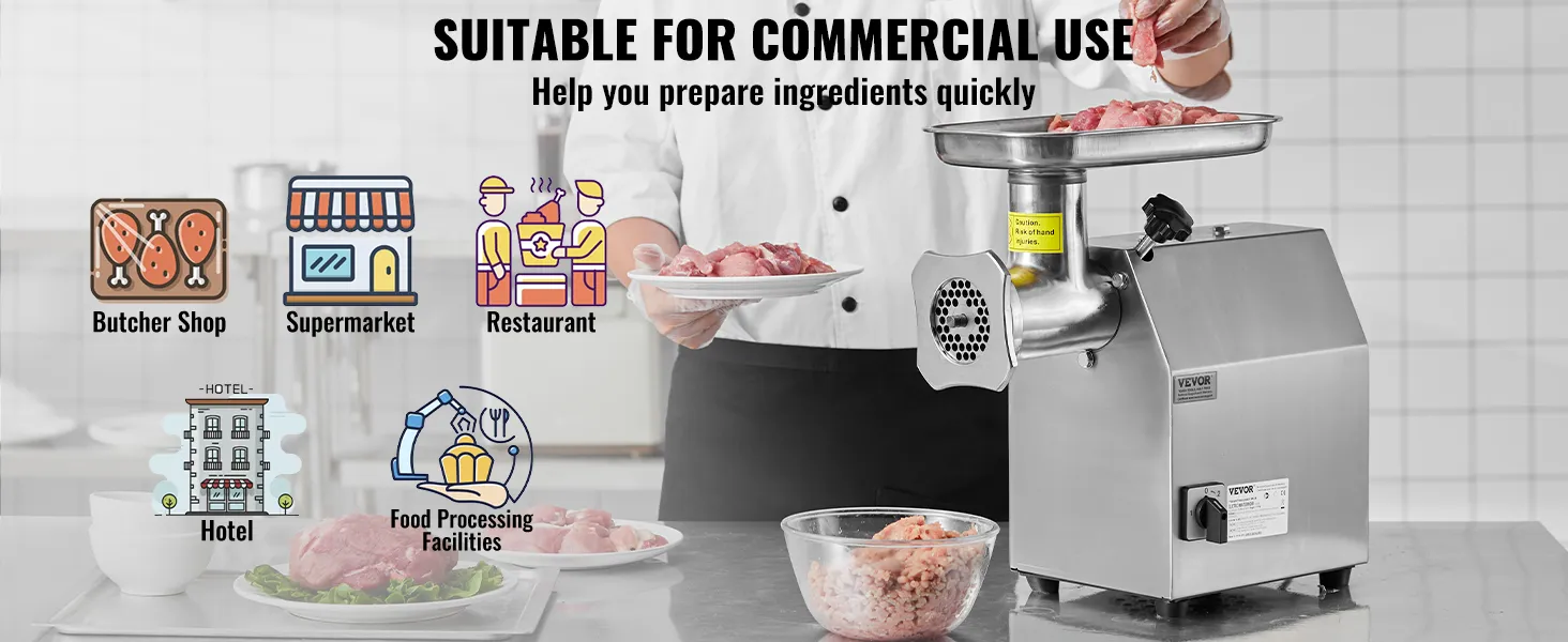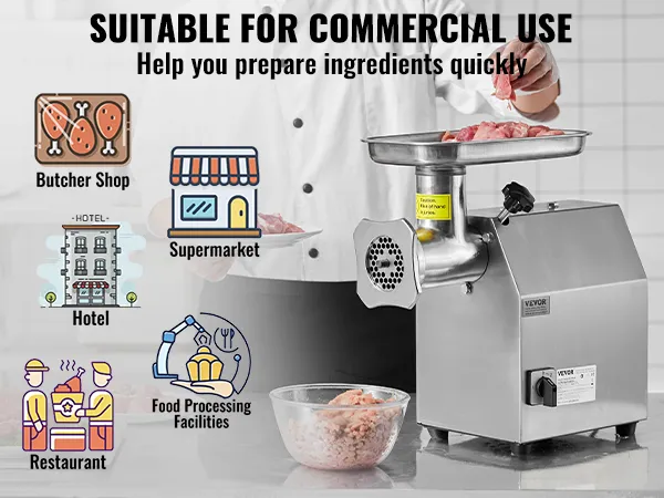 This meat grinder is suitable for grinding various types of meat, making it ideal for use in butcher shops, supermarkets, restaurants, hotels, and food processing facilities.