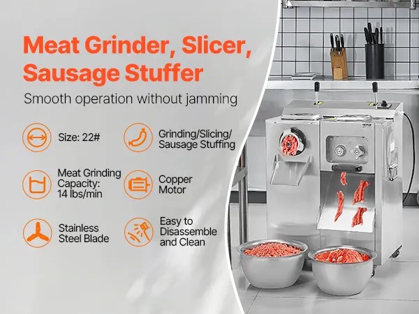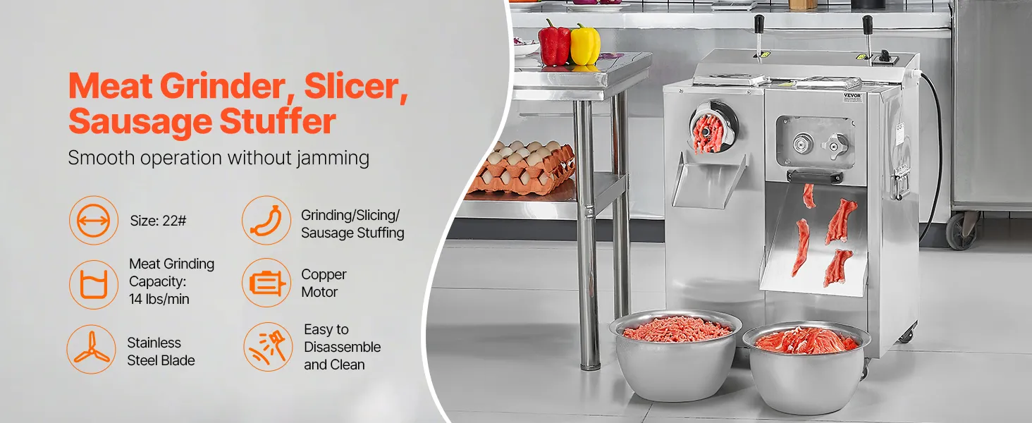 • 3-in-1 Multifunctional: The commercial meat grinder and slicer features a #22 size caliber, making it a versatile machine for grinding meat and vegetables without jamming. Smoothly slice, shred, and dice with consistent output, achieving uniform meat results and more efficient sausage stuffing—ideal for quickly preparing various sausages and cured meats.