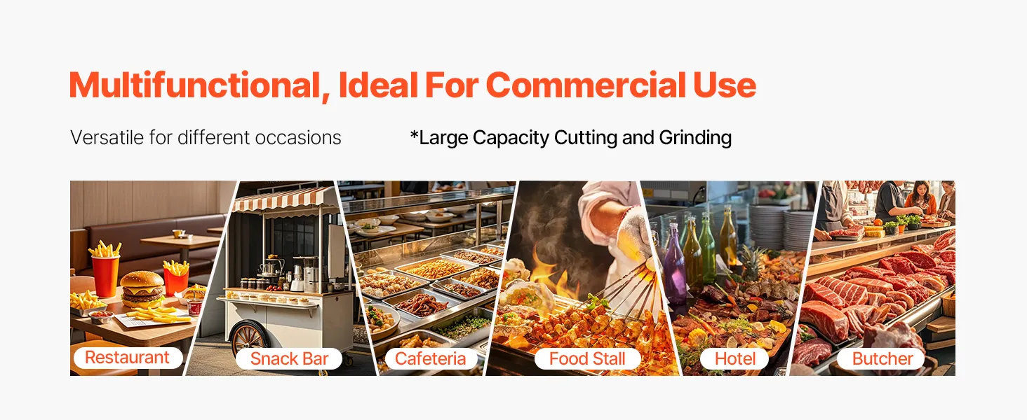 Suitable for grinding and slicing meat, fish, and vegetables, this commercial meat grinder and slicer is ideal for kitchens, restaurants, and factories—serving both personal and commercial needs.