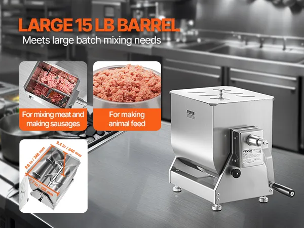 Large Capacity Tank: The 248 x 195 x 240 mm / 9.8 x 7.7 x 9.4 in mixing tank can hold approximately 15 pounds of meat ingredients. It's ideal for large-scale sausage production, other delicacies, or even animal feed preparation. The tilting design makes it easier to unload the meat.