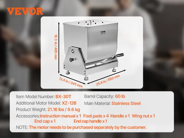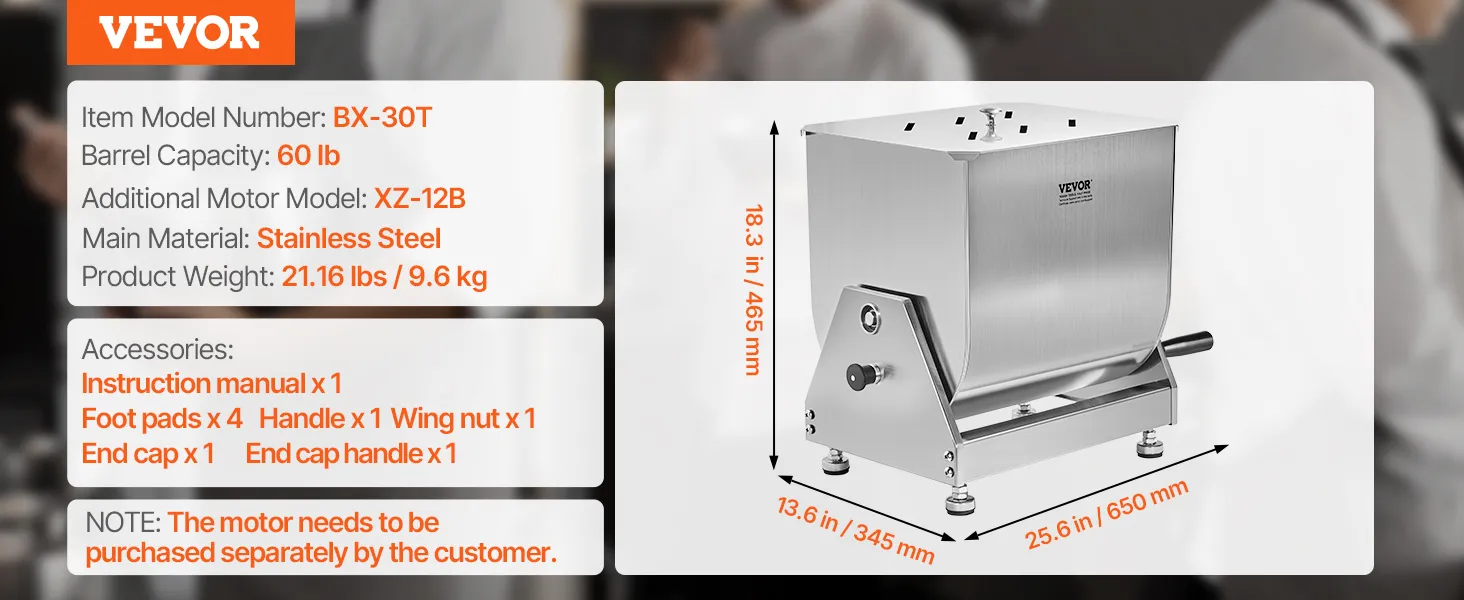 Gearbox Structure: This meat mixer features a gearbox design, making operation more effortless. It is compatible with the VEVOR drive motors XZ-12B, allowing for hands-free operation, so one person can easily handle the task.