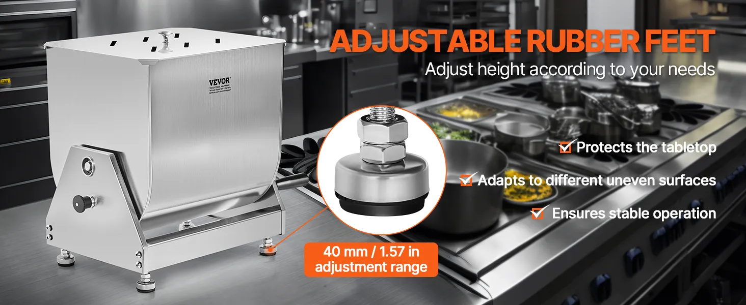 The commercial manual meat mixer features adjustable rubber feet with a flexible height range, providing both protection for the surface and enhanced stability during operation.