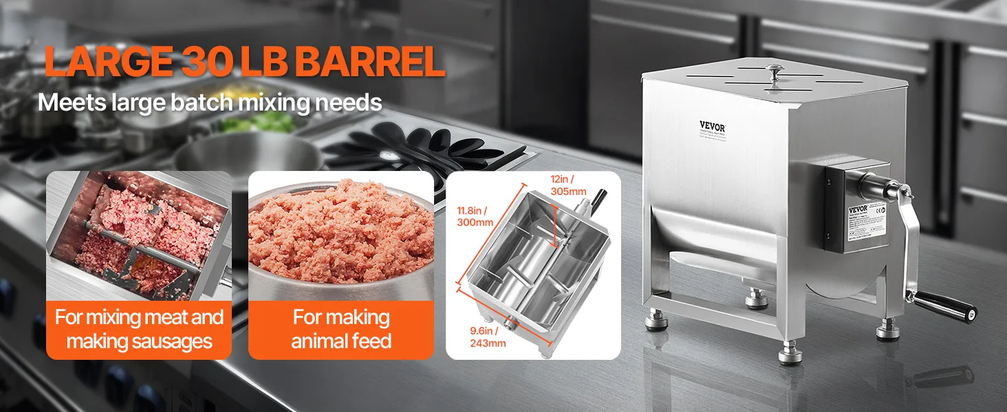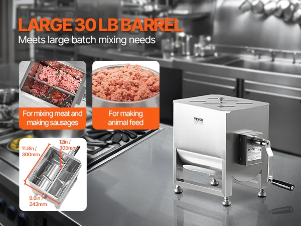 Large Capacity Tank: The 300 x 243 x 305 mm / 11.8 x 9.6 x 12.0 in mixing tank can hold approximately 30 pounds of meat ingredients. It's ideal for large-scale sausage production, other delicacies, or even animal feed preparation.