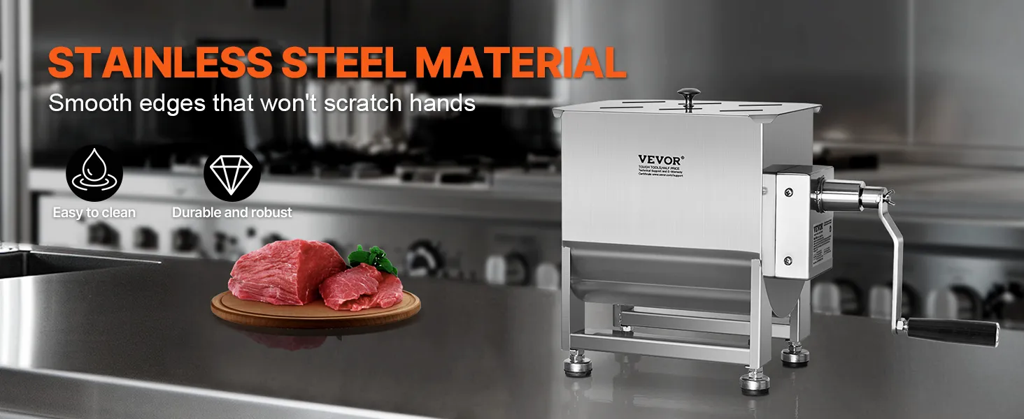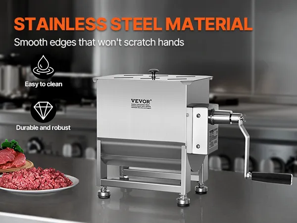 This 30 lbs meat mixer is made of durable 201 stainless steel, ensuring long-lasting strength. It is easy to operate and capable of efficiently mixing large quantities of various meats.