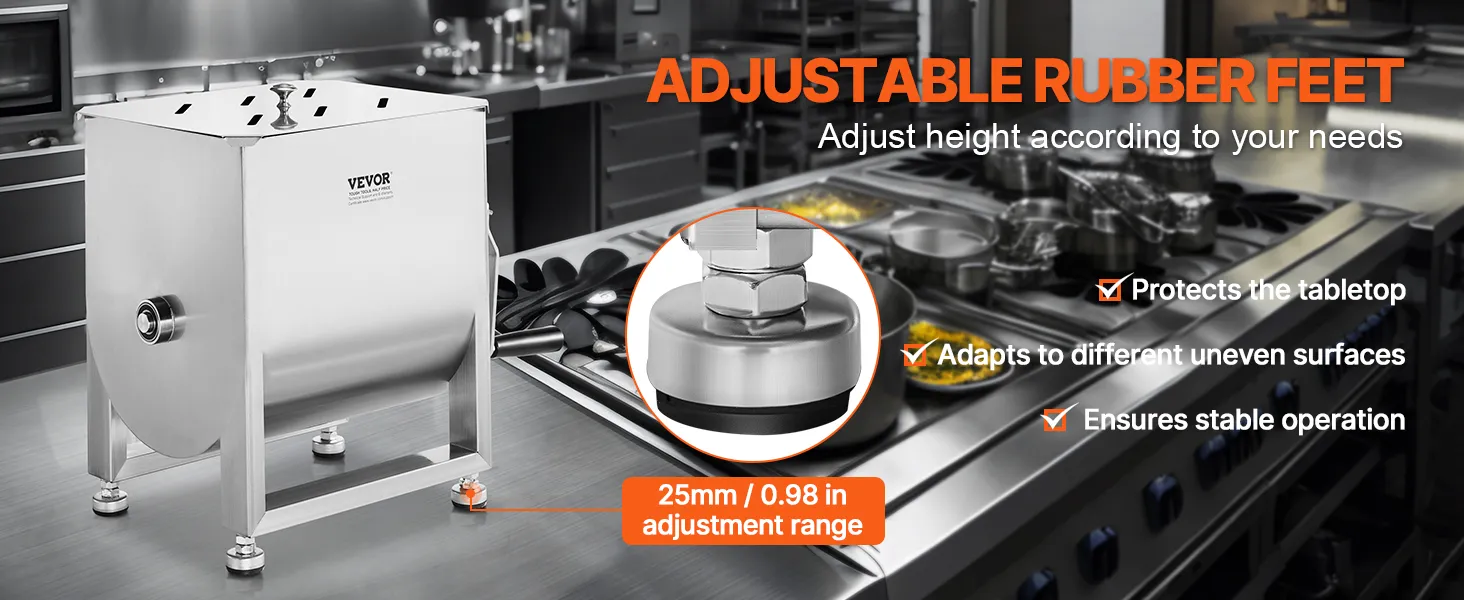 The commercial manual meat mixer is equipped with adjustable rubber feet, providing a height adjustment of 25mm (0.98 in). This design helps protect the surface while ensuring stable operation.