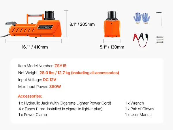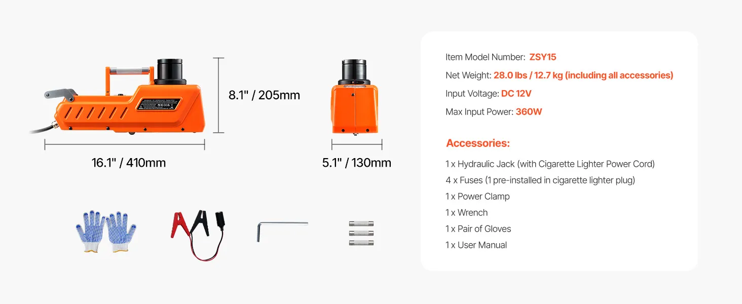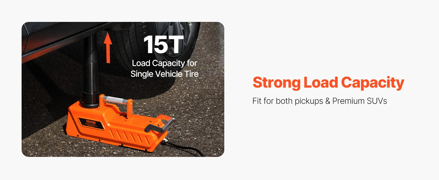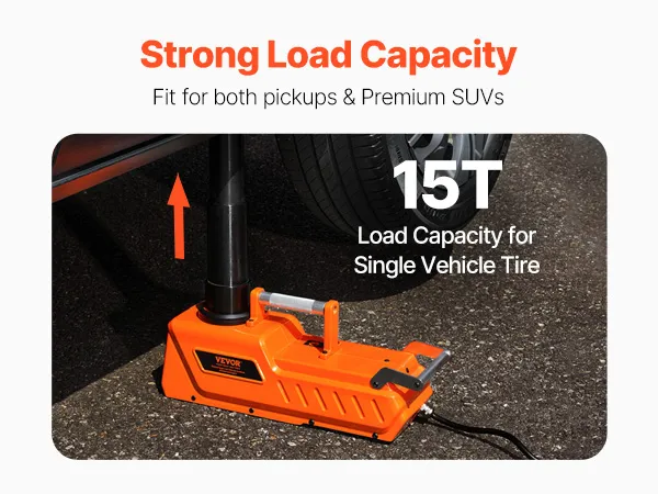 Voor voertuigen van 15 ton: deze elektrische krik is ontworpen voor het hydraulisch heffen van individuele banden op voertuigen tot 15 ton, waardoor deze gemakkelijk toegankelijk is voor auto's, SUV's enz. Let op: De krik moet op een vlakke ondergrond worden gebruikt en verticaal ten opzichte van uw voertuig worden geplaatst.