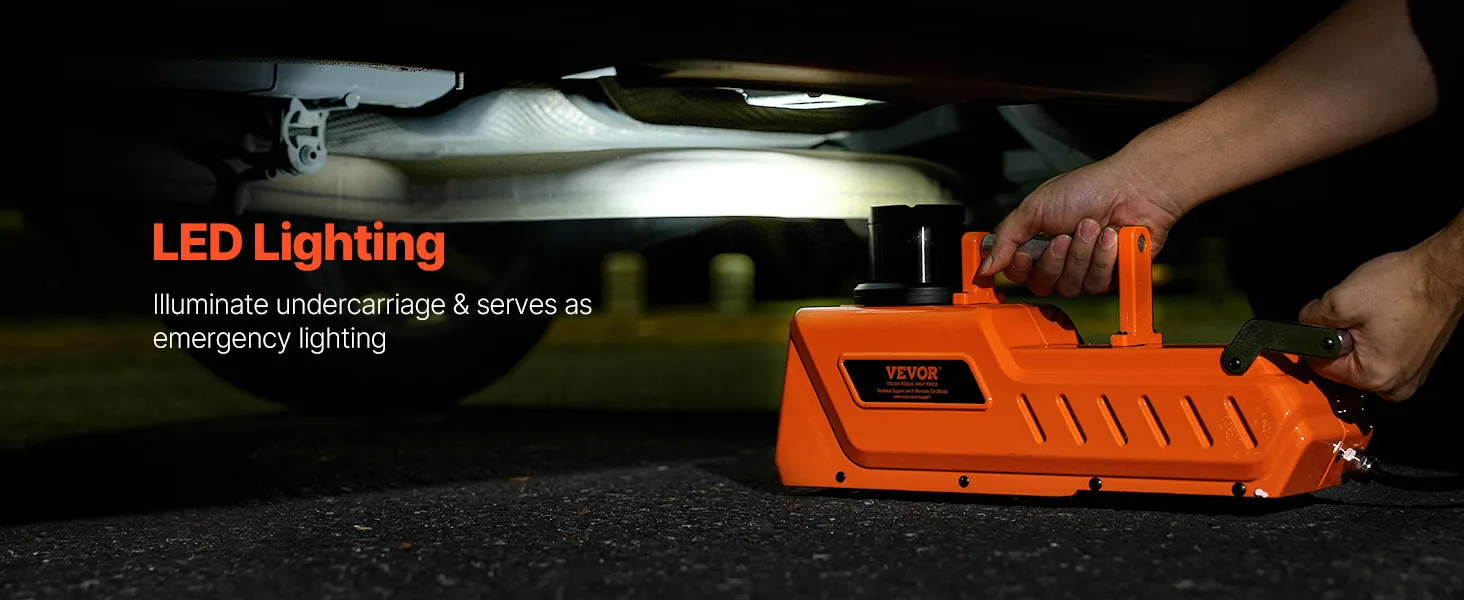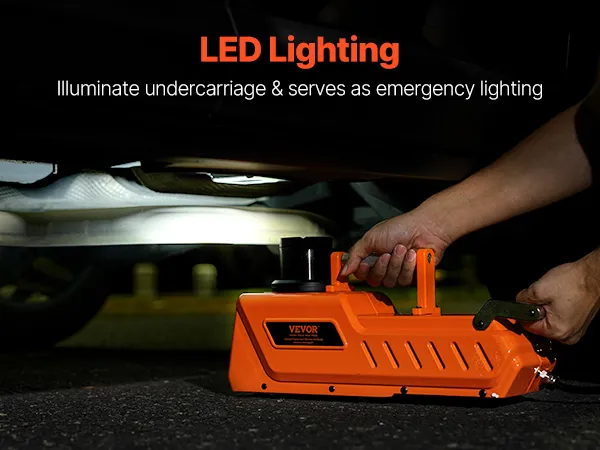 Deze elektrische krik is uitgerust met heldere LED-verlichting en zorgt voor een goed zicht onder het voertuig, zelfs bij weinig licht. Het helpt u bij het vinden van de juiste hijspunten en dient tevens als noodverlichting tijdens nachtelijke bandenreparaties.