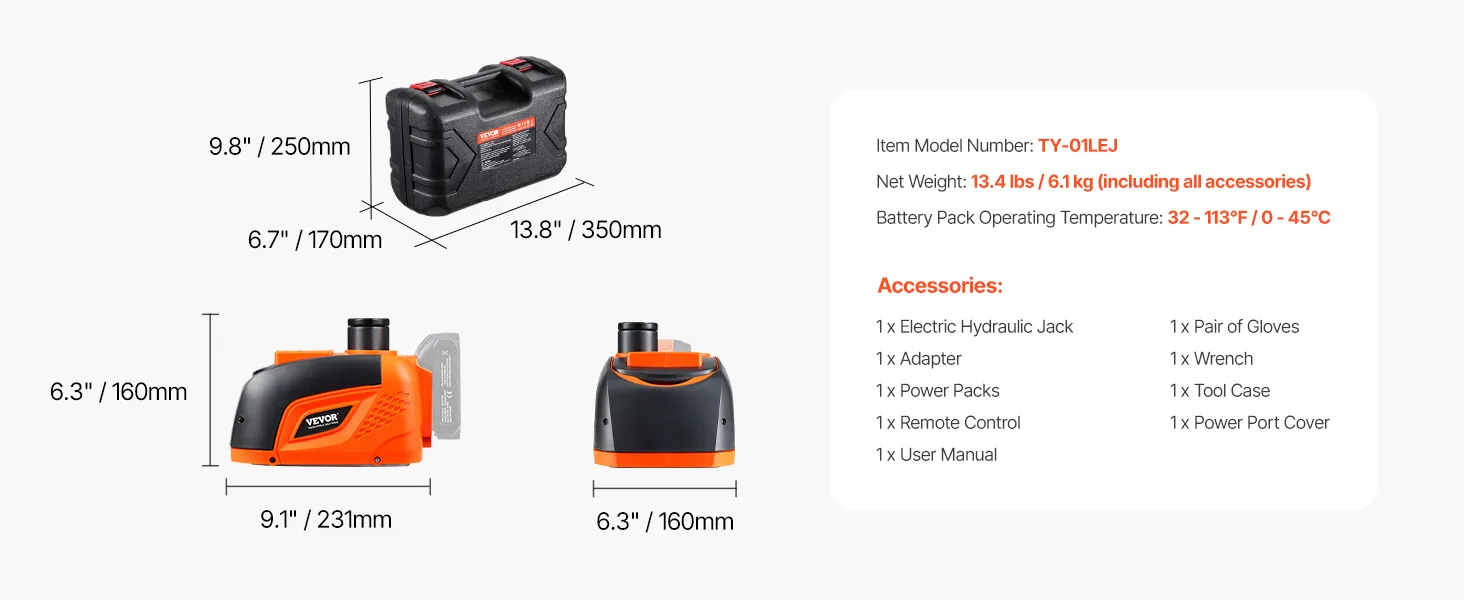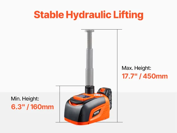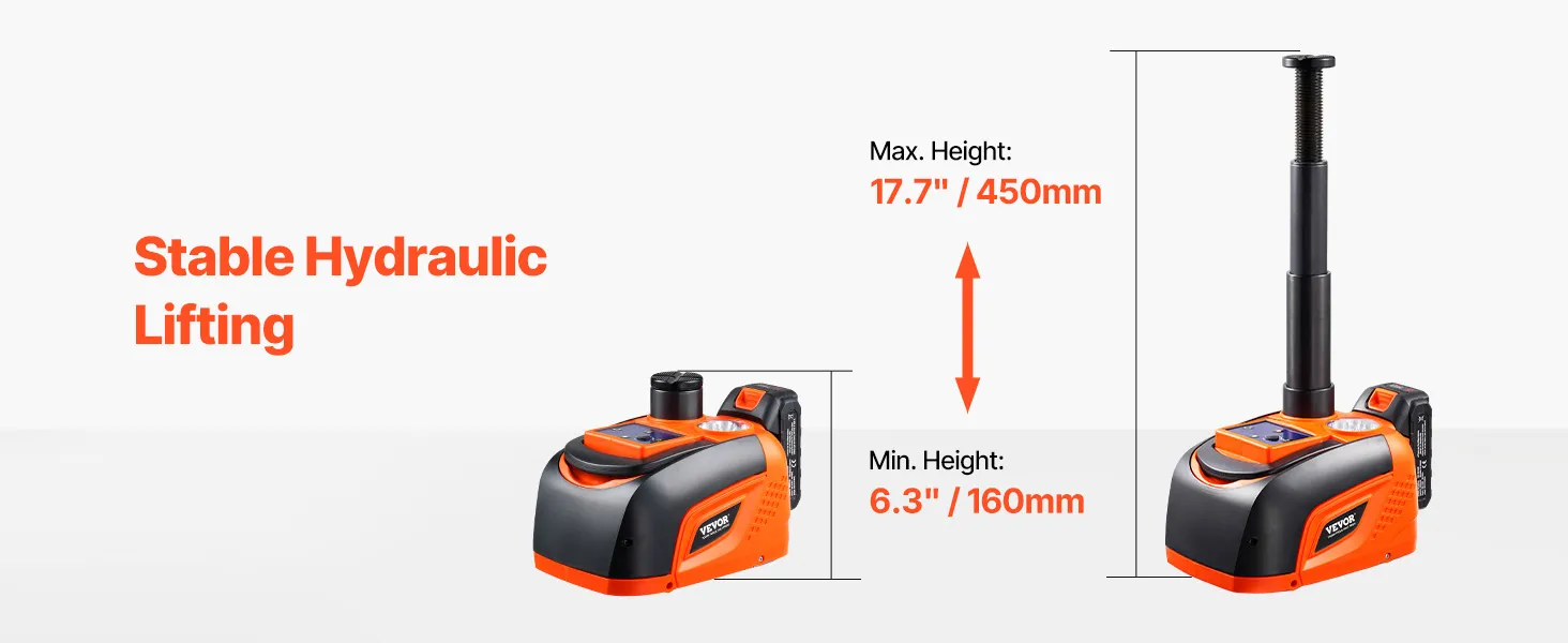 Wide Lifting Range: Hydraulic lifting range: 6.3-17.7 inch / 160-450 mm. Our electric car jack is equipped with a wireless remote with a range of over 5 meters, making it easier to lift vehicles and reach various chassis heights.