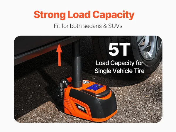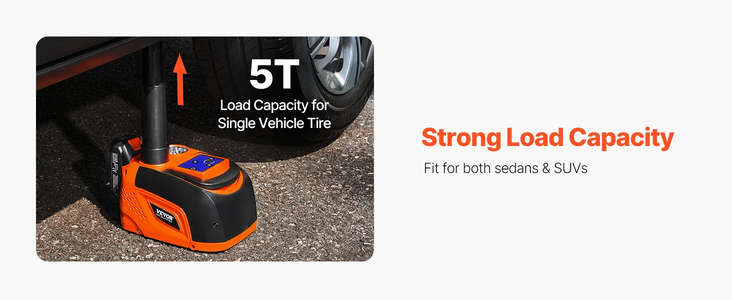 For 5T Vehicles: Our electric car jack is designed for hydraulic lifting of a single tire on 5T vehicles such as cars, SUVs, and trucks. Note: The jack must be used on a flat surface and placed vertically with your vehicle.