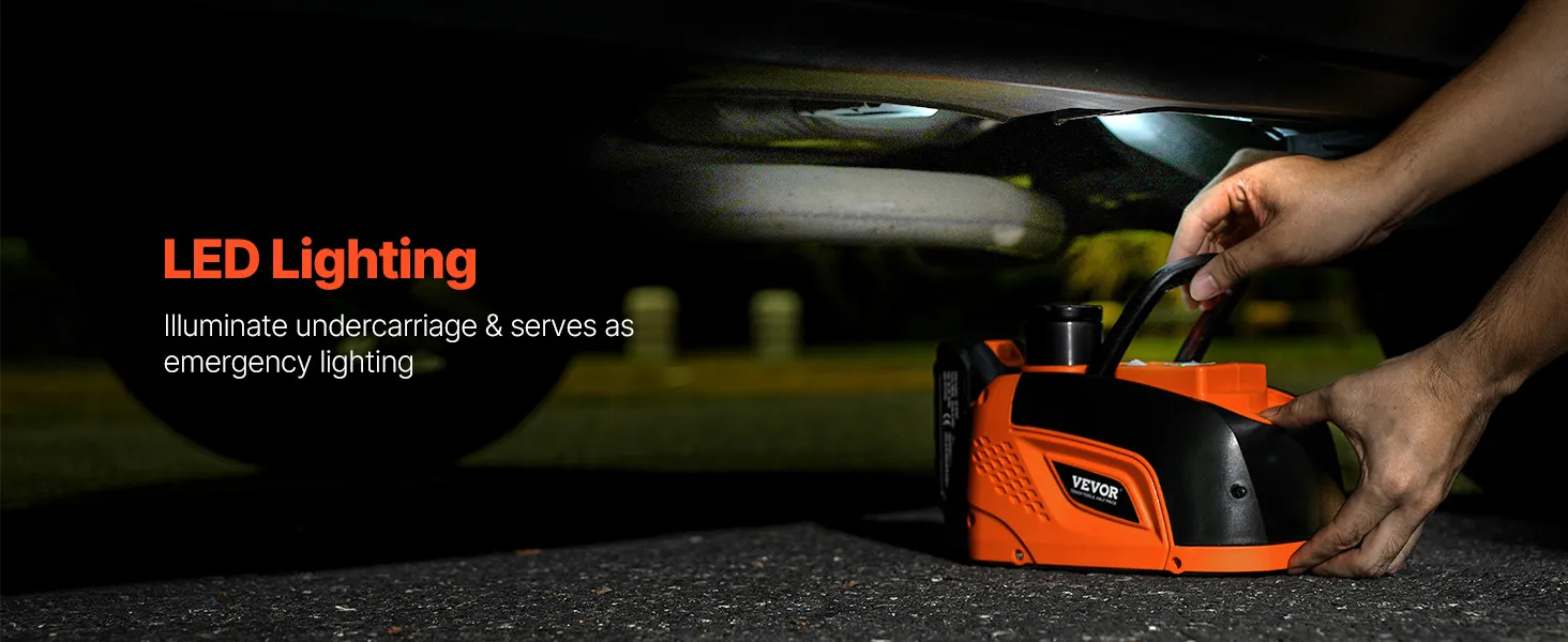 Equipped with bright LED lights, this electric car jack kit ensures that you can easily see the underside of your vehicle, even in low light conditions. It helps you locate the right lifting points and doubles as an emergency light during night-time tire repairs.
