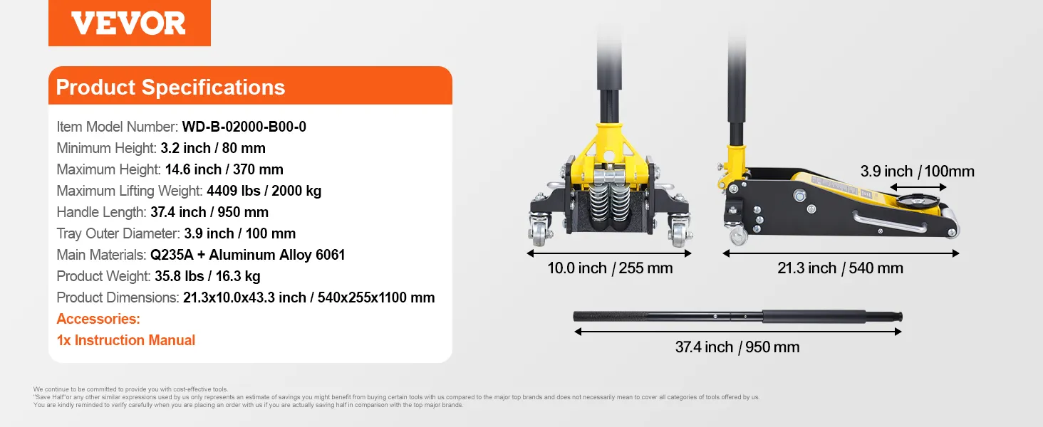 Maximaal laadvermogen van 2 ton: onze krik kan gemakkelijk tot 2 ton heffen, waardoor hij geschikt is voor sportwagens, gezinssedans, lichte pick-up trucks en SUV's. Het is perfect voor taken zoals het vervangen van banden, inspecties/reparaties van het remsysteem, vervanging van het uitlaatsysteem, onderhoud van de ophanging en ander chassiswerk. Of u nu een professionele monteur bent of een amateur-autoliefhebber, uw voertuig optillen is moeiteloos.