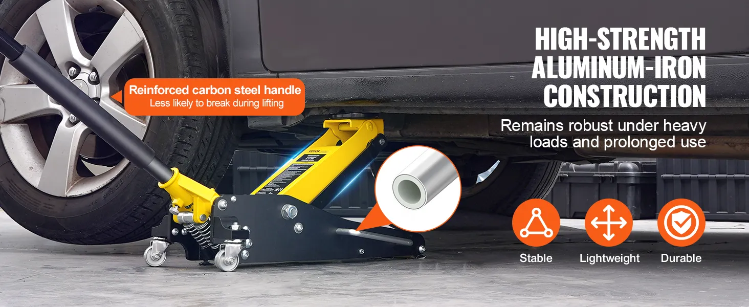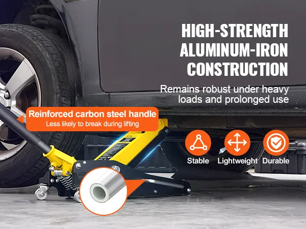 Stevige aluminium ijzeren constructie: Dankzij het gelaste frameontwerp blijft de kleine krik stabiel tijdens gebruik. Het combineert de sterkte van ijzer met de lichtgewicht eigenschappen van aluminium, waardoor wiebelen, vervorming en corrosie worden verminderd en het gemakkelijk te dragen en te gebruiken is. De handgreep van koolstofstaal is versterkt en verdikt om breuk bij het tillen te voorkomen.