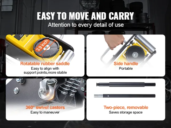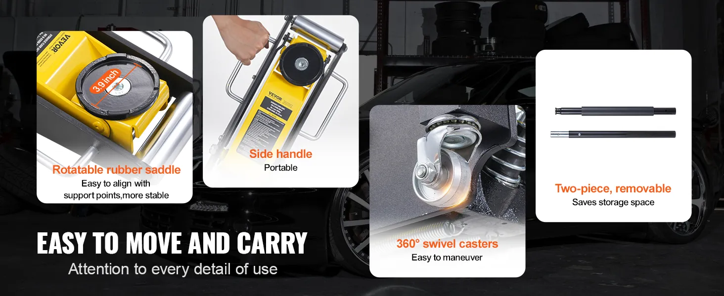Uitgerust met een groot rubberen zadel om het voertuig te beschermen; Dankzij de dubbele handgrepen en zwenkwielen aan de zijkant kan de krik snel en gemakkelijk worden verplaatst en getransporteerd; het handvat is afneembaar.