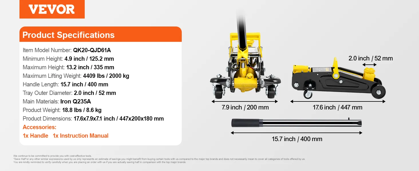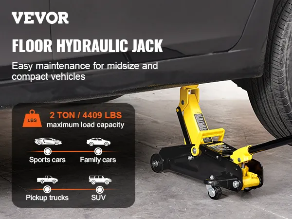 De hydraulische krik kan voertuigen met een gewicht tot 2 ton heffen en is geschikt voor gewone sedans en kleine pick-up trucks. Dit maakt autoreparaties eenvoudiger en minder stressvol.